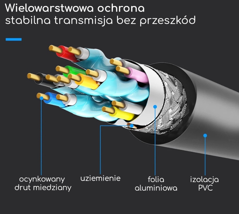 - Zewnętrzna warstwa ochronna kabla w oplocie PVC zapobiega strzępieniu się i chroni przed codziennymi uszkodzeniami.