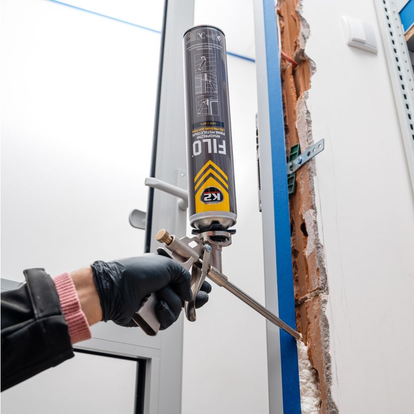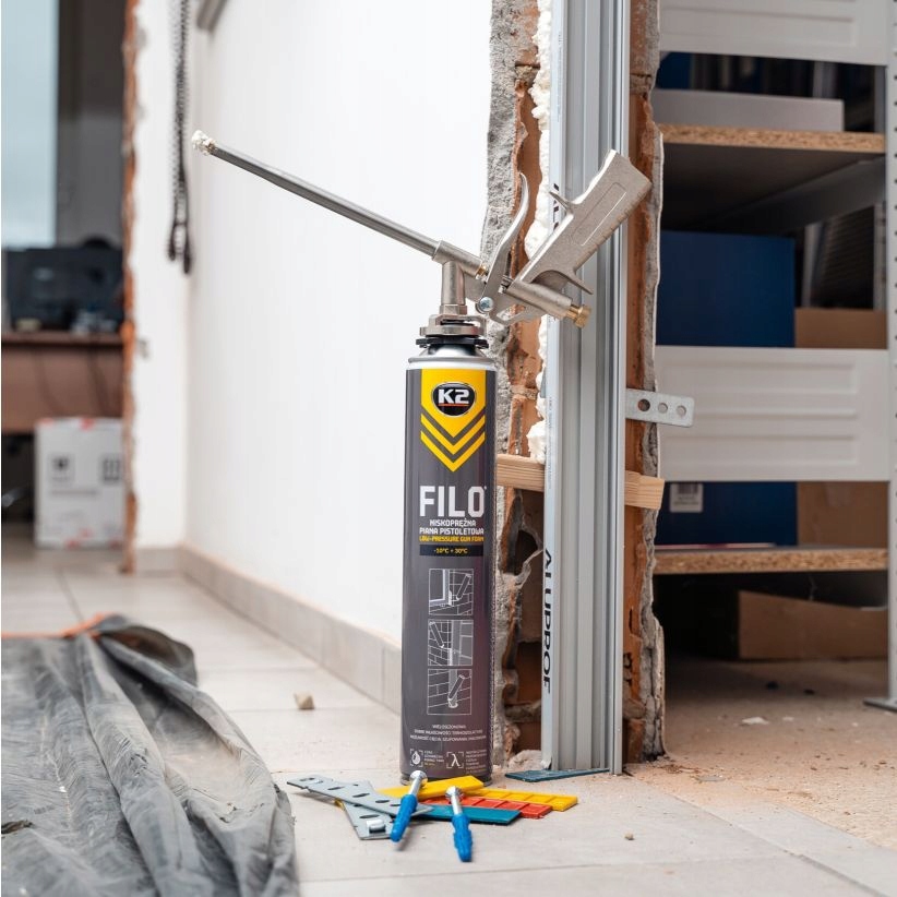 K2 FILO® niskoprężna piana pistoletowa, całoroczna o bardzo dobrej przyczepności do (PVC, aluminium, drewna, styropian, stali, beton, gips, kamień itp.), Przeznaczona do montażu stolarki okiennej i drzwiowej, wygłuszania i uzupełniania pustych przestrzeni podczas montażu parapetów, schodów, przepustów rurowych i kablowych, brodzików, skrzynek podtynkowych itp.