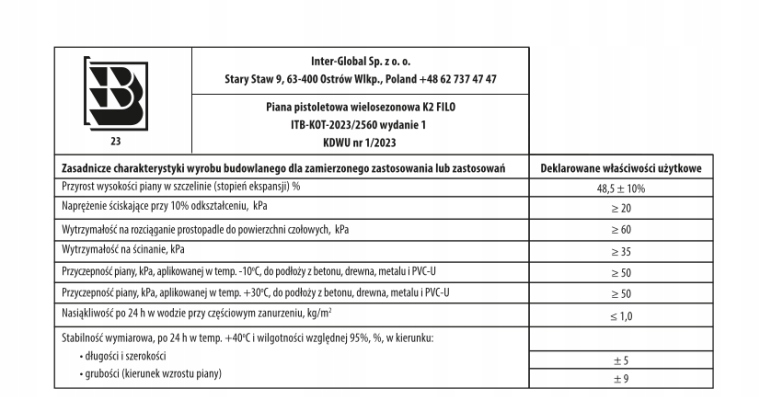 Piana K2 FILO® posiada opinie ITB i jest oznaczona znakiem budowlanym "B".