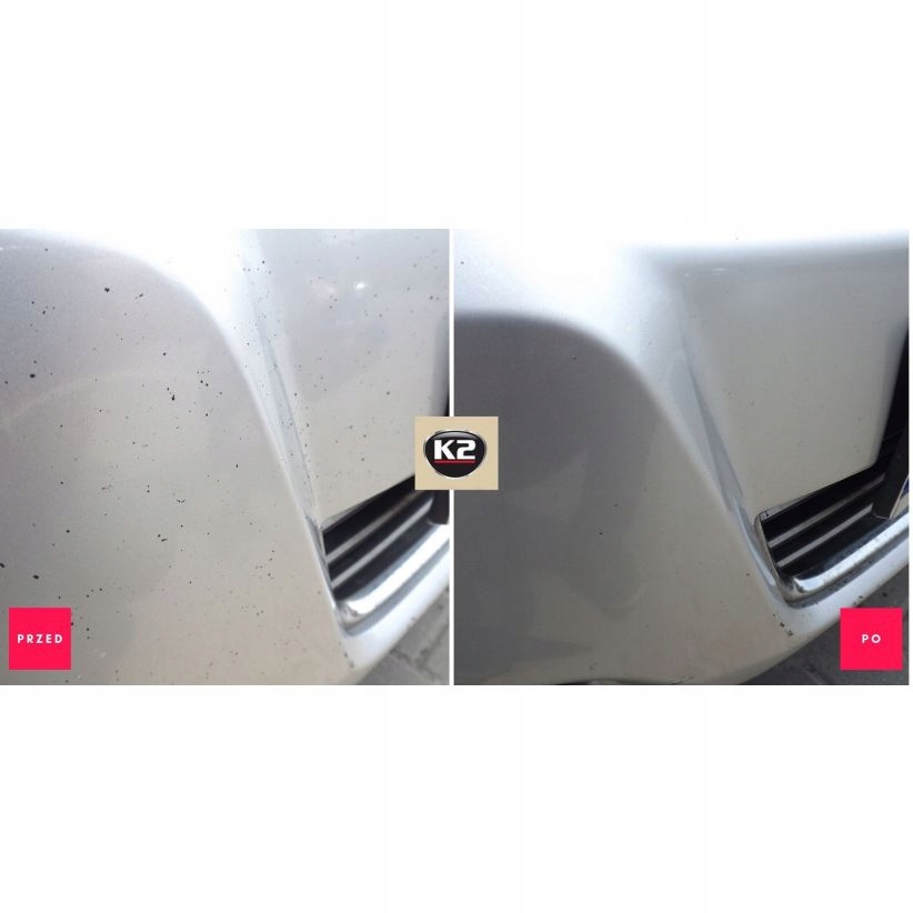- Odczekać ok. 30 sekund aż brud się rozpuści, przetrzeć szmatką i od razu spłukać obficie wodą lub przejść do mycia nadwozia szamponem K2 EXPRESS.