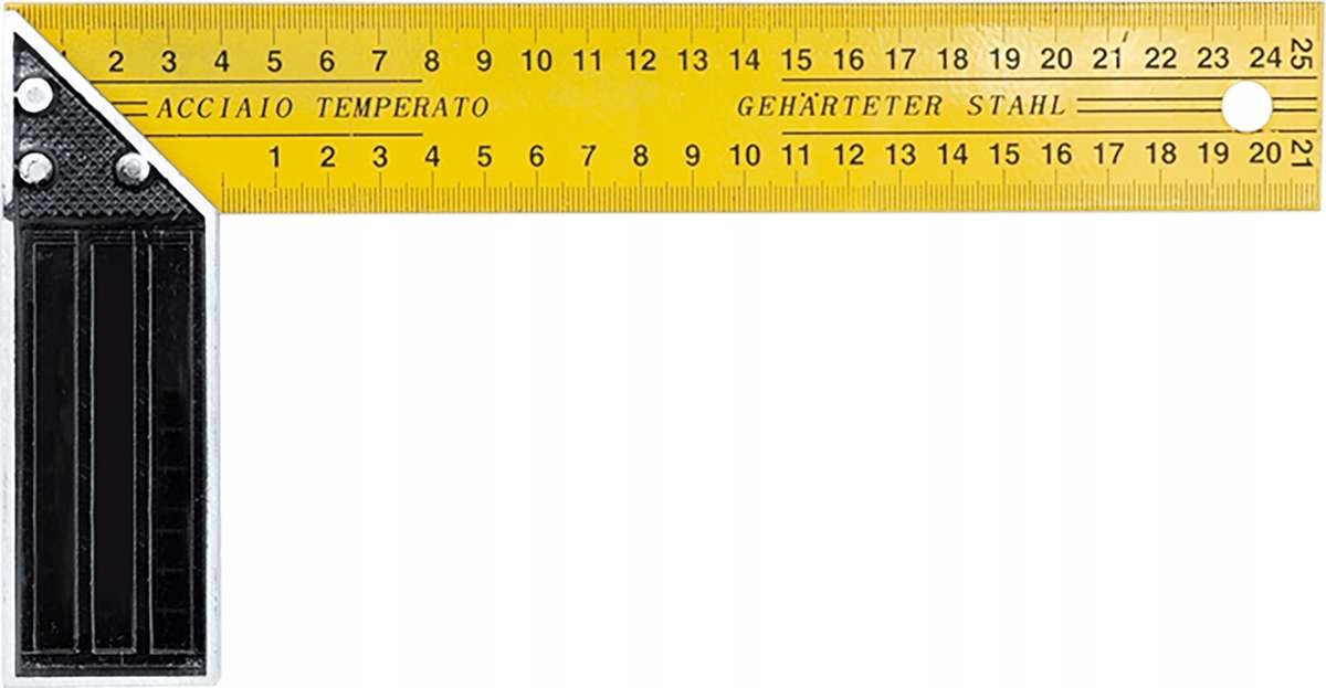 Kątownik z aluminiową stopką, ramię wykonane z hartowanej blachy, lakierowany, żółty z naniesioną czytelną, czarną podziałką milimetrową. Połączenie stopki i ramienia wyznacza kąt 45°.