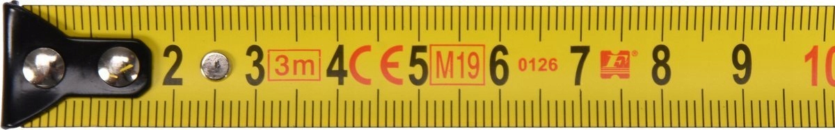 Miara zwijana z taśmą stalową, wykonana w II klasie dokładności. Taśma ze specjalnej , sprężystej blachy , lakierowana i dodatkowo zabezpieczona powłoką nylonową chroniącą przed wilgocią , ścieraniem a także blaknięciem pod wpływem światła słonecznego. Zakończona ruchomym hakiem /przystosowanym do pomiarów wewnętrznych i zewnętrznych /. Kolor taśmy żółty , na górnej i dolnej krawędzi naniesiona podziałka milimetrowa . Zwarta obudowa wykonana z odpornego na uszkodzenia mechaniczne tworzywa abs . Miara posiada dwie blokady wysuwu taśmy . Przycisk umieszczony w podstawie służy do chwilowego zablokowania , klawisz na froncie obudowy po przesunięciu blokuje taśmę trwale.. Dla wygody użytkownika wyposażona w klips mocujący i krótką smycz.