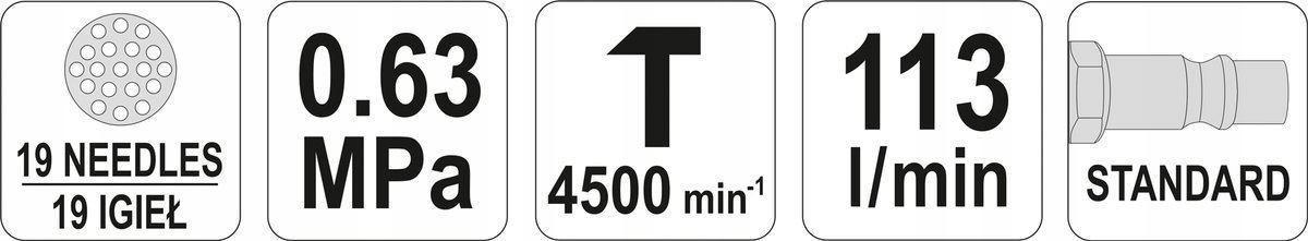 Igłowy młotek pneumatyczny marki YATO, zasilany strumieniem sprężonego powietrza. Przeznaczony do usuwania m.in. zgorzeliny, topnika, kamienia kotłowego, rdzy, farby z elementów konstrukcji stalowych w warsztatach blacharsko-lakierniczych, samochodowych, zakładach produkcyjnych, podczas majsterkowania.