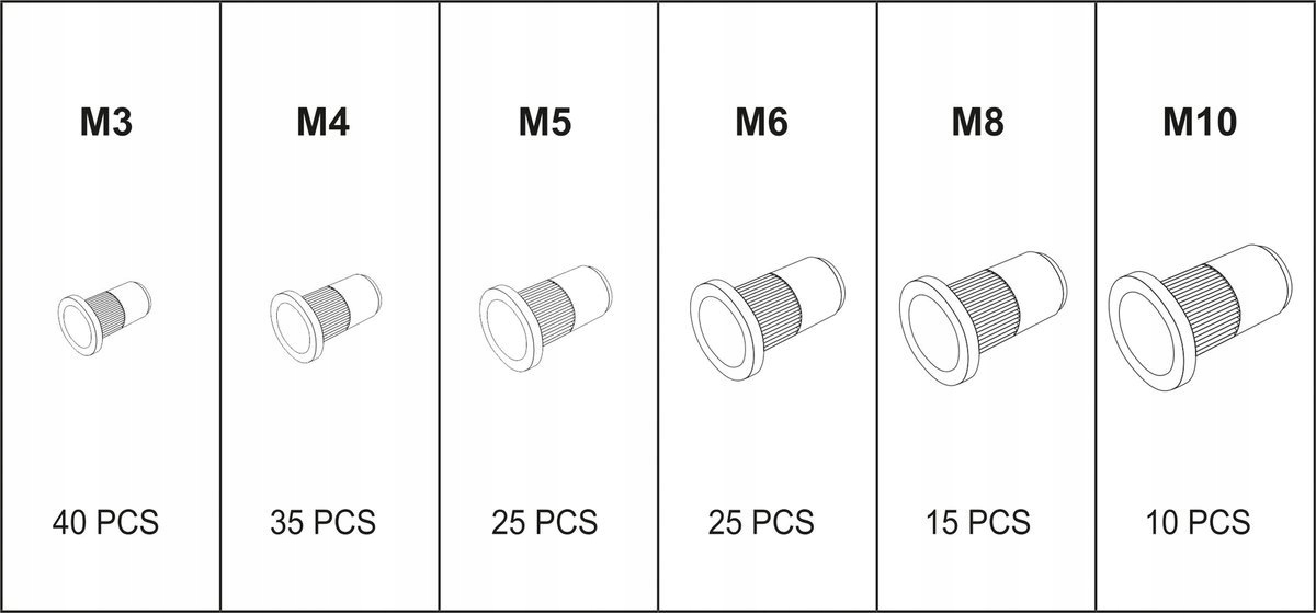 Zestaw stalowych nitonakrętek M3-M10 marki YATO.. Kołnierz walcowy, radełkowany, dzięki czemu ściślej przylega do mocowanego elementu.