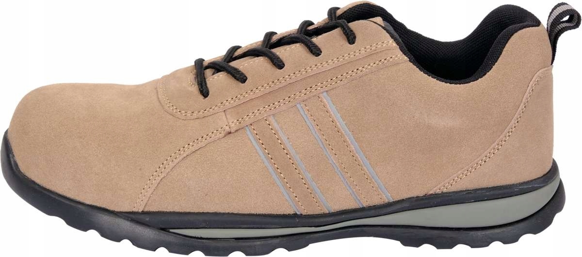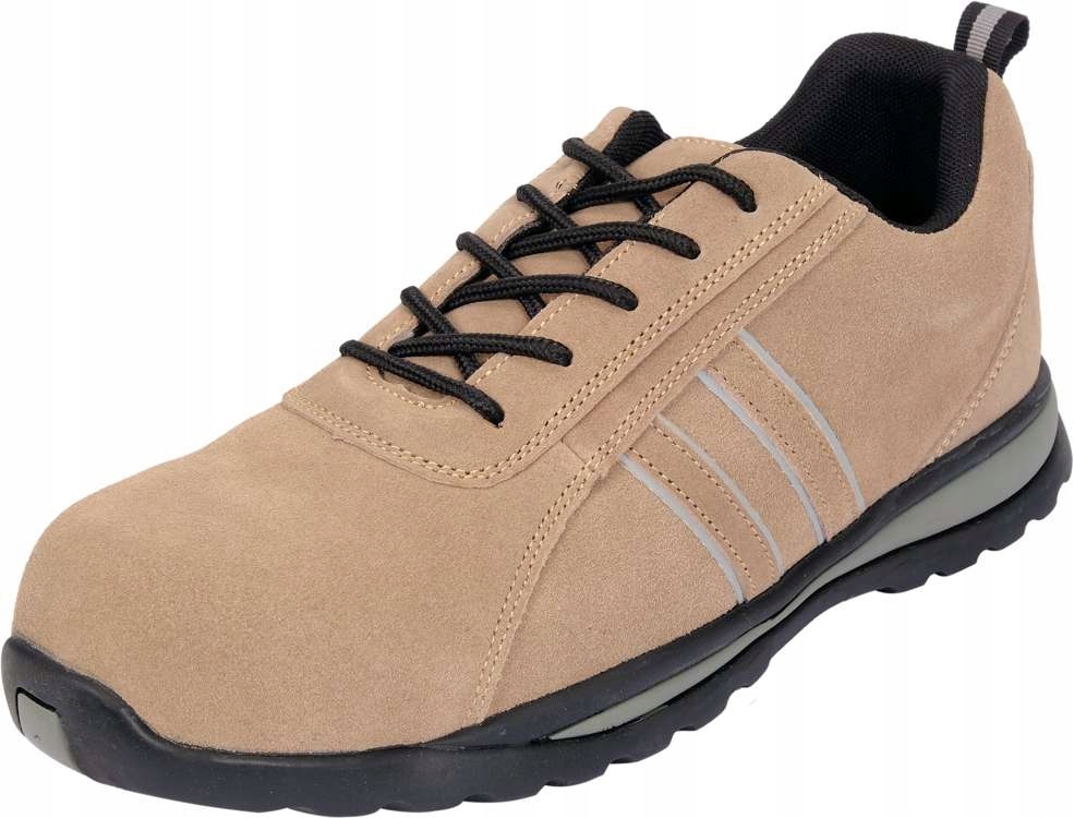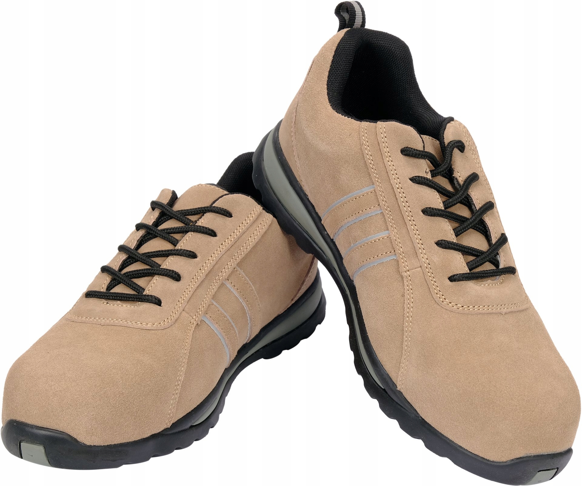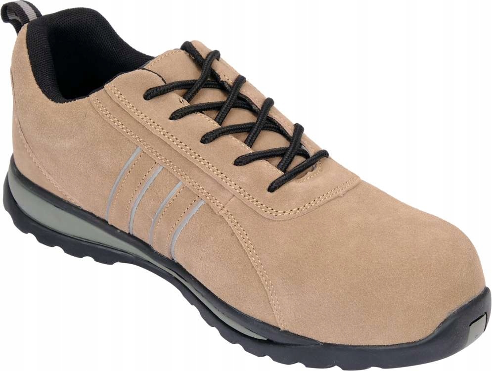 Półbuty nie zawierają metalu. Zarówo wkładka antyprzebiciowa, jak i gumowa podeszwa są elastyczne i - w przeciwieństwie do butów z tradycyjną podeszwą z PU i wkładką stalową - nie ograniczają zgięć śródstopia. Cholewkę z naturalnej skóry zamszowej ozdobiono odblaskowymi wstawkami poprawiającymi widoczność użytkownika.
