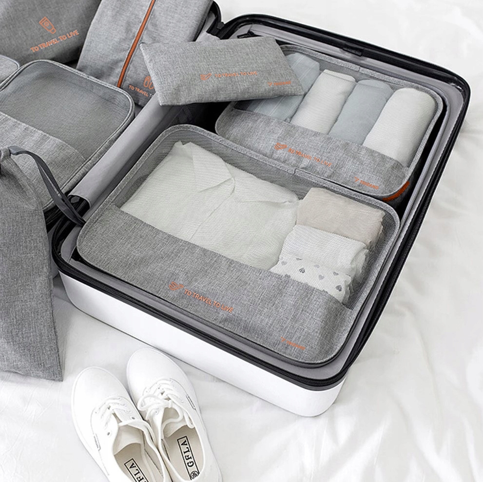 W zestawie znajdująsię różnej wielkości torby. 2 organizery z siatką + 2 saszetki, które możesz wykorzystać na pranie w drodze powrotniej z podróży + organizer + organizer ściągany + organizer na buty.