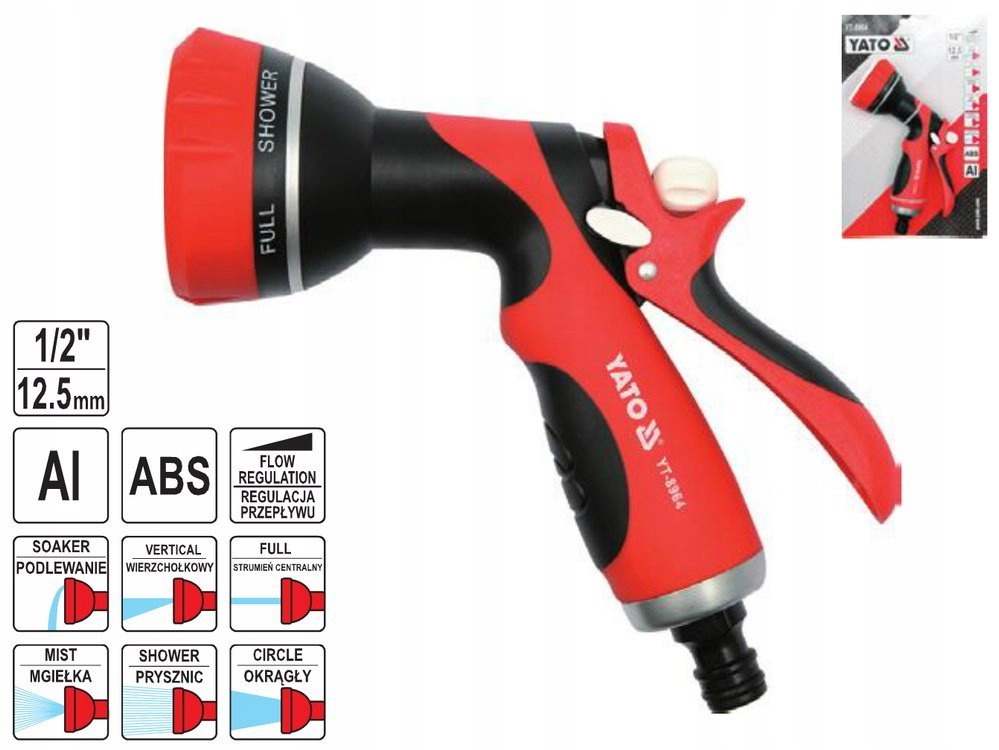 Pistolet zraszający wielofunkcyjny: 6 rodzajów strumienia, regulacją przepływu i funkcją stop. Idealny do podlewania, nawadniania i czyszczenia. Lekki, zbudowany z aluminium i elementów abs. Tryb pracy ciągłej.