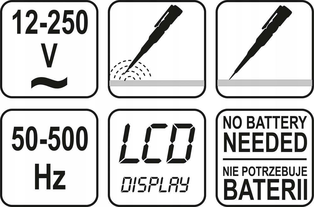 Wskaźnik przeznaczony dla mechaników, konserwatorów obsługujących instalacje elektryczne jak i dla "zwykłych użytkowników domowych gniazdek". Występowania napięcia sygnalizowane jest na ekranie LCD. Test wykonujemy "dotykowo" lub indukcyjnie tylko zbliżając wskaźnik do badanej instalacji.