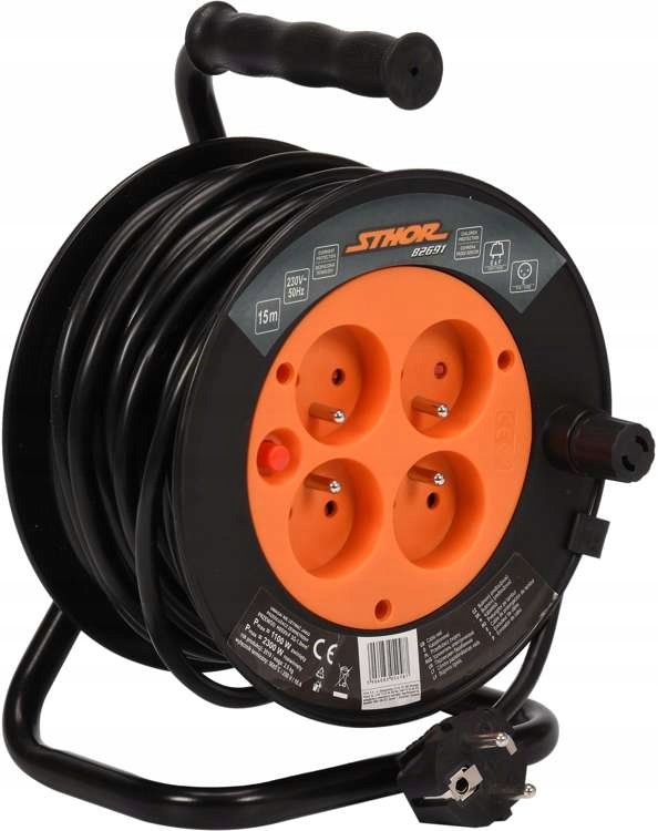 Przedłużacz bębnowy marki STHOR 82691 o długości 15 metrów z 4 gniazdami, zabezpieczeniem termicznym oraz zabezpieczeniem przed dziećmi. Przewód nawinięty na bęben wykonany z lekkiego i wytrzymałego tworzywa. Bęben osadzony na solidnym metalowym stelażu z ergonomiczną rękojeścią. Rączka umieszczona przy krawędzi bębna przyspiesza zwijanie, a gumowy element przymocowany do przewodu kilka centymetrów przed wtyczką umożliwia zaczepienie go np. do krawędzi bębna, co znacznie ułatwia przechowanie i transport zwiniętego przedłużacza.