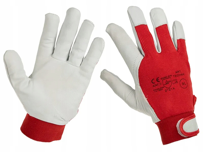 Rękawice całodłonicowe wykonane z miękkiej koziej skóry, która została połączona z elastyczną czerwoną tkaniną. Mankiet jest zapinany na rzep. W połączeniu ze ściągaczem daje możliwość właściwego dopasowania. Są wygodne i nie krępują ruchów. Zapewnią ochronę dłoni przed otarciami.