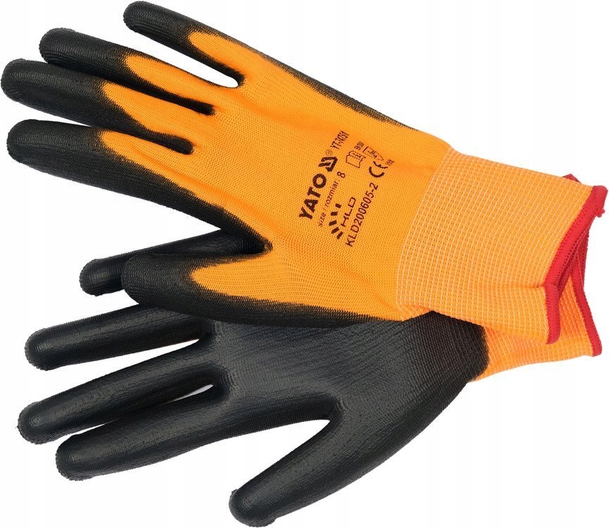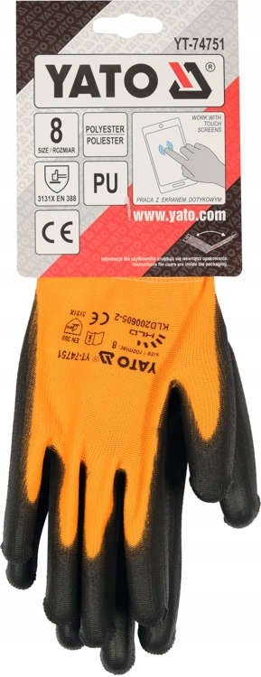 Rękawice robocze ochronne wykonane z pomarańczowego poliestru, powlekane w części chwytnej czarnym poliuretanem ze specjalną domieszką umożliwiającą płynną obsługę ekranów dotykowych w urządzeniach takich jak smartfon czy tablet.