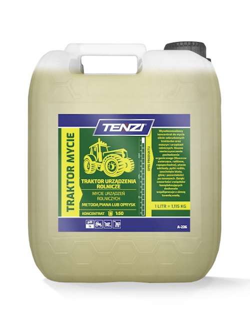 Wysokozasadowy koncentrat do mycia silnie zabrudzonych traktorów oraz maszyn i urządzeń rolniczych. Usuwa zanieczyszczenia pochodzenia organicznego tłuszcze zwierzęce, roślinne, ropopochodne), ptasie odchody, pyłki roślin, zaschnięte błoto, glinę i pozostałości po nawozach. Dzięki zawartości związków kompleksujących doskonale współpracuje z zimną twardą wodą.