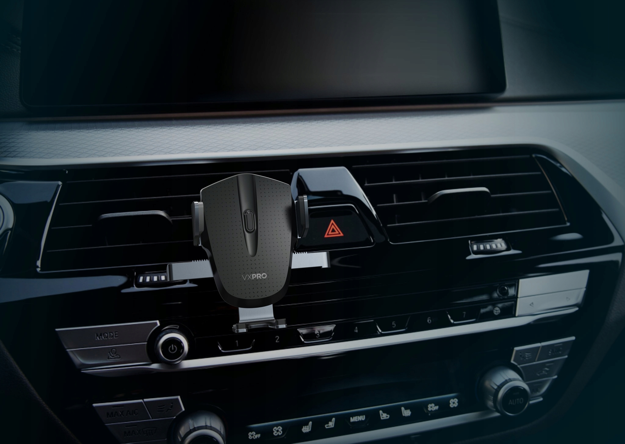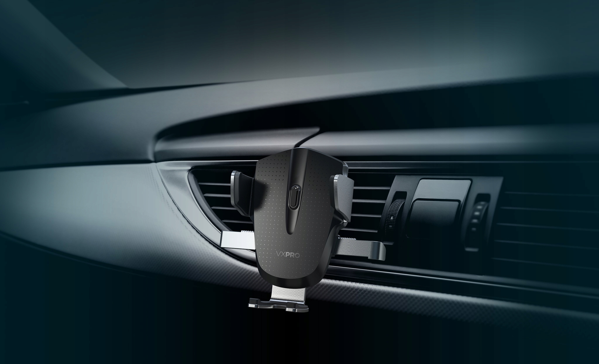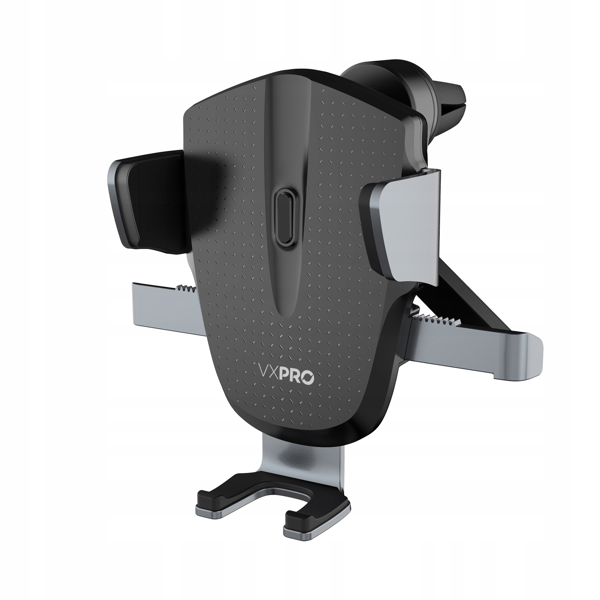 Kompaktowy uchwyt samochodowy na telefon montowany na kratkę nawiewną.