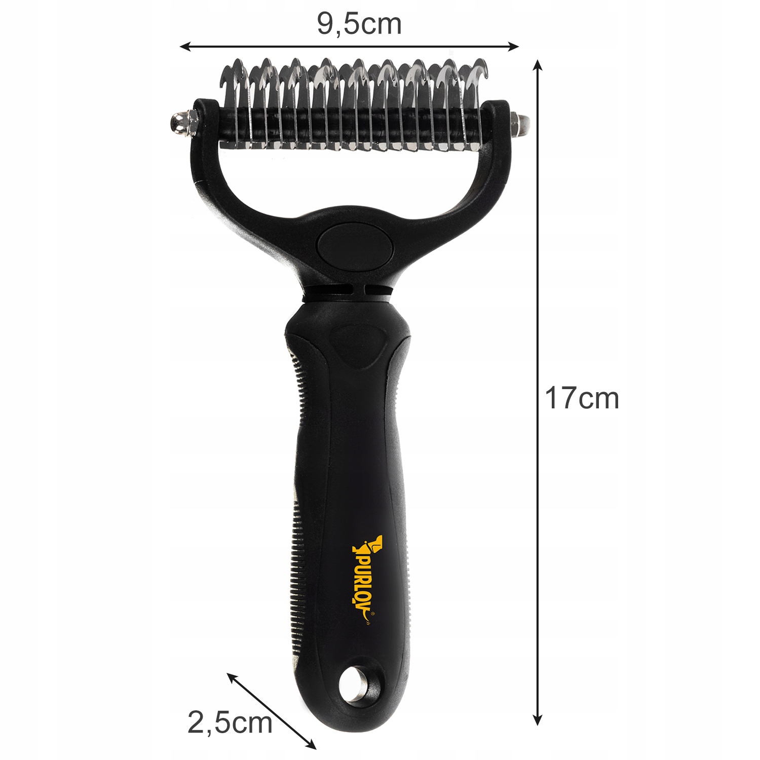 Zgrzebło posiada 17 oraz 9 ostrzy z nierdzewnej stali z zakrzywionymi zębami. To najbezpieczniejsze rozwiązanie dla zwierzęcia podczas usuwania starego podszerstka oraz splątanej sierści i kołtunów. Przy regularnym czesaniu, zapobiega powstawaniu nowych kołtunów, usuwa martwy włos i wygładza sierść.