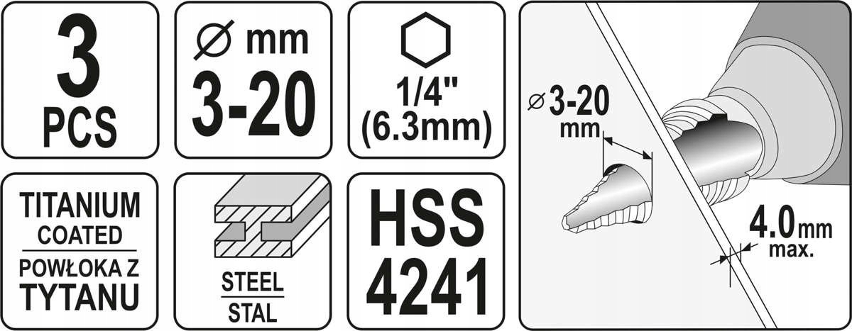 WIERTŁA STOPNIOWE STOŻKOWE DO METALU ZESTAW 3-20mm