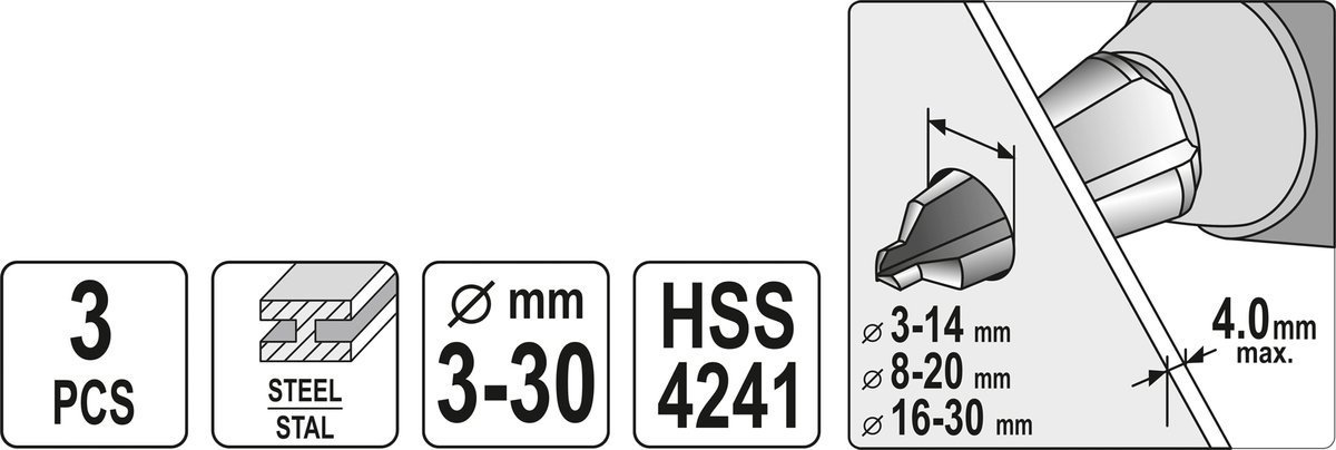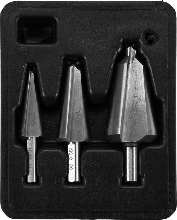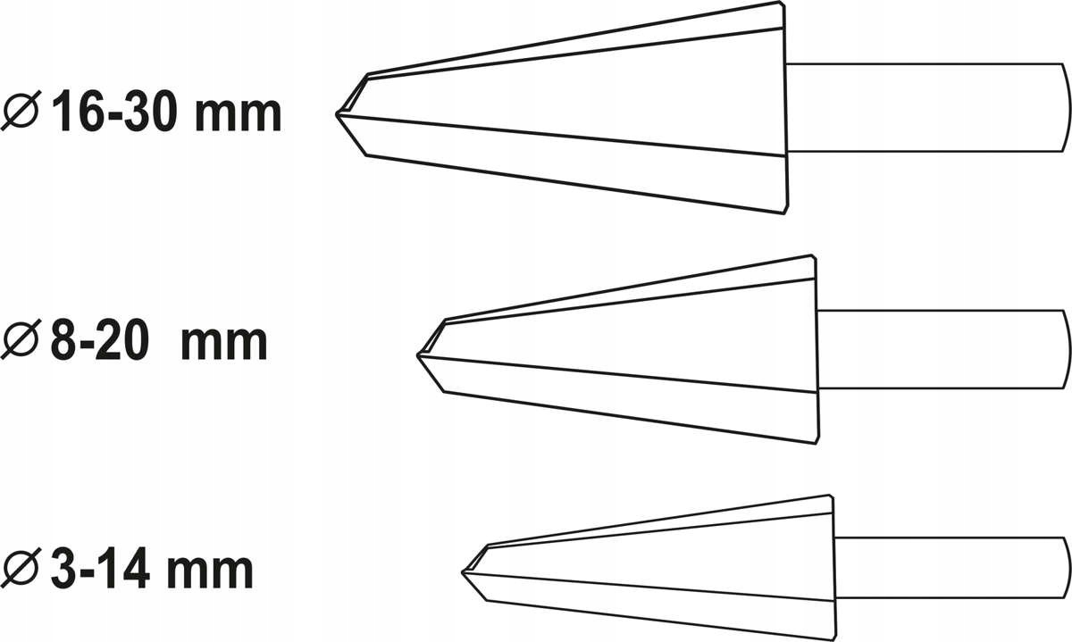 Zestaw wierteł stożkowych marki YATO z wytrzymałej i szybkotnącej stali HSS, które umożliwiają wiercenie w twardych stalach stopowych, aluminium, blachach i PVC. Specjalnie wyprofilowany, stożkowy profil ułatwia nawiercanie i centrowanie. Dzięki użyciu szybkotnącej stali krawędzie wierconych otworów pozostają czyste i bez zadziorów. Zestaw zapakowany w poręczną kasetkę zawiera 3 rozmiary wierteł.