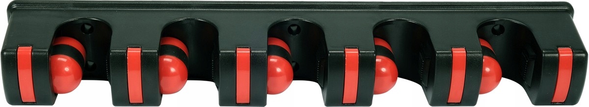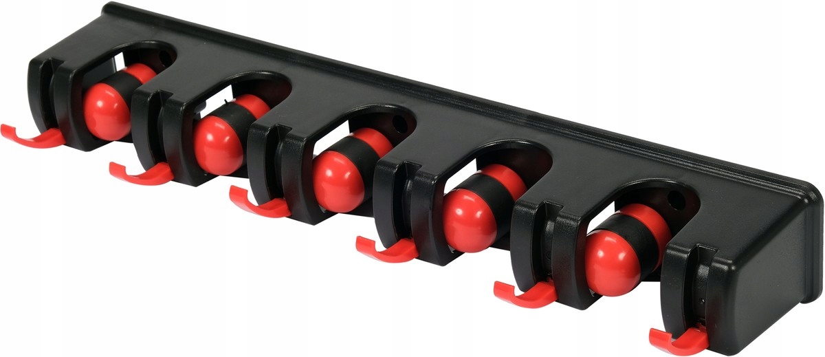 Praktyczny naścienny wieszak na narzędzia ogrodowe i domowe. Posiada 5 automatycznych uchwytów dopasowujących się do grubości trzonka oraz 6 składanych haczyków.