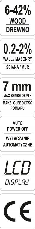 - dokładność pomiaru:- dla materiałów budowlanych +/-0,1%- dla drewna +/-2,0%