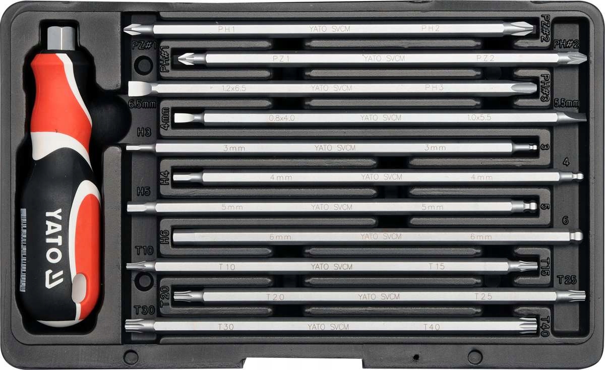 W skład zestawu wchodzi wkrętak z zestawem 11 dwustronnych bitów. Uchwyt wkrętaka wykonany z dwu kompozytowego tworzywa ze standardowym mocowaniem oraz mocowaniem typu "T".
