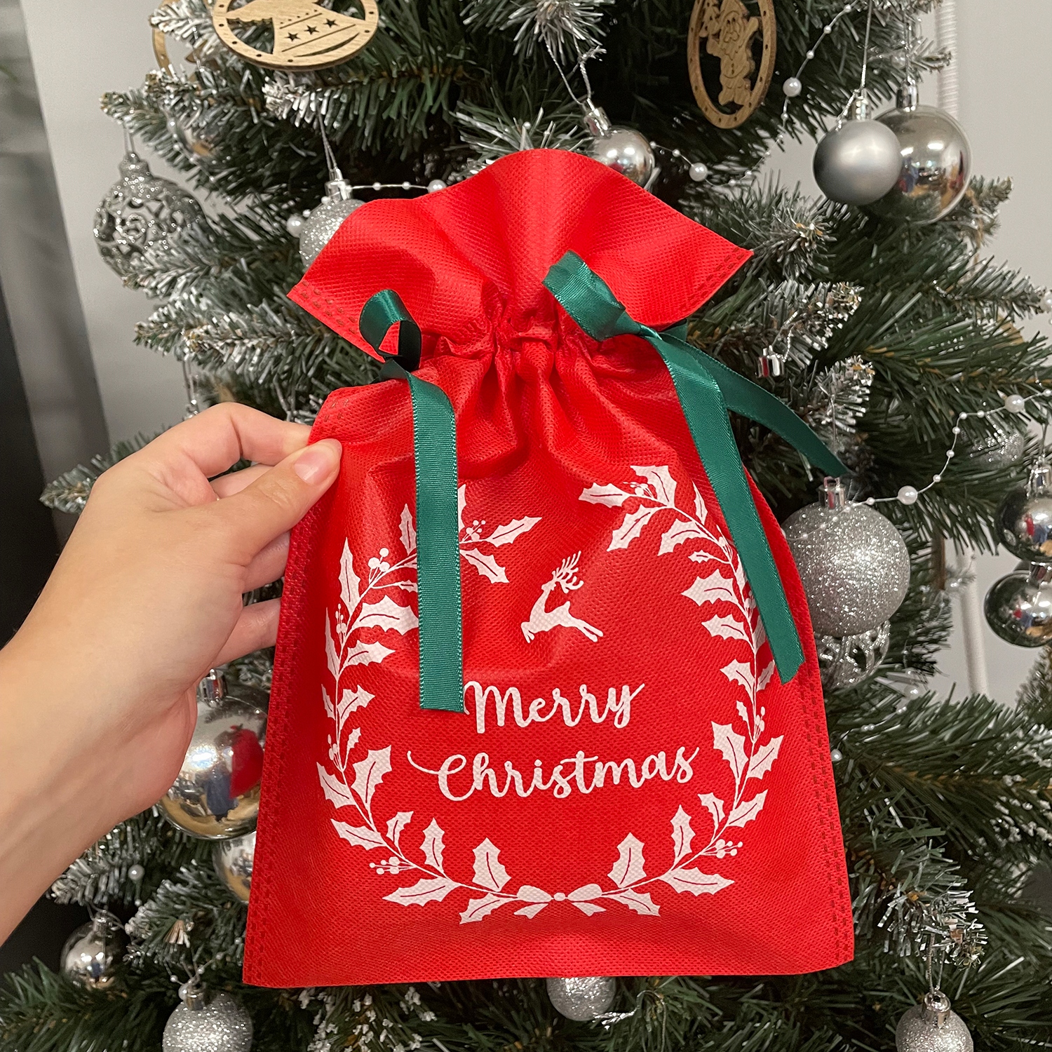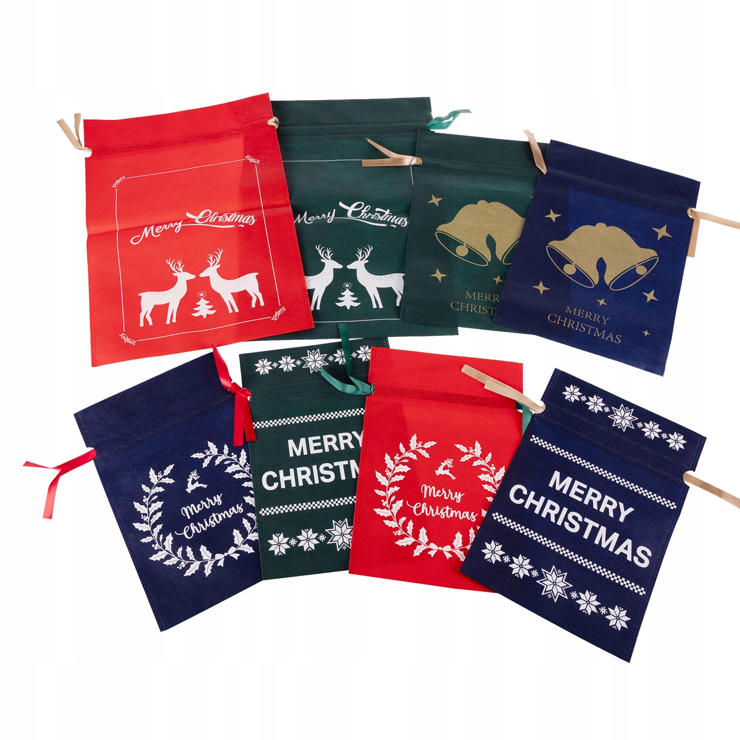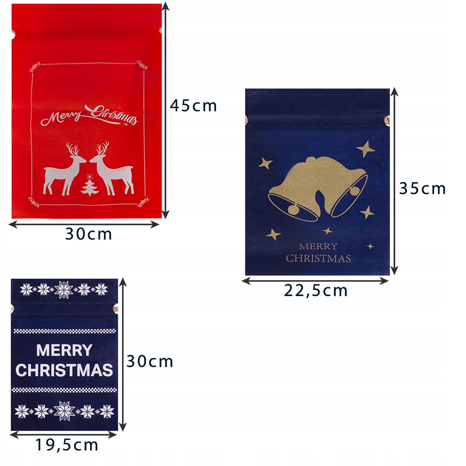 - ŚWIĄTECZNY WZÓR - ta unikalna kolekcja torebek pozwoli Ci zapakować prezenty w prosty i gustowny sposób bez użycia taśmy i nożyczek. Tył worków jest jednokolorowy, natomiast na przodzie znajdują się białe lub złote nadruki: reniferów, dzwonków, gałązek ostrokrzewu, gwiazdek. Każdy woreczek ma także napis „Merry Christmas”.