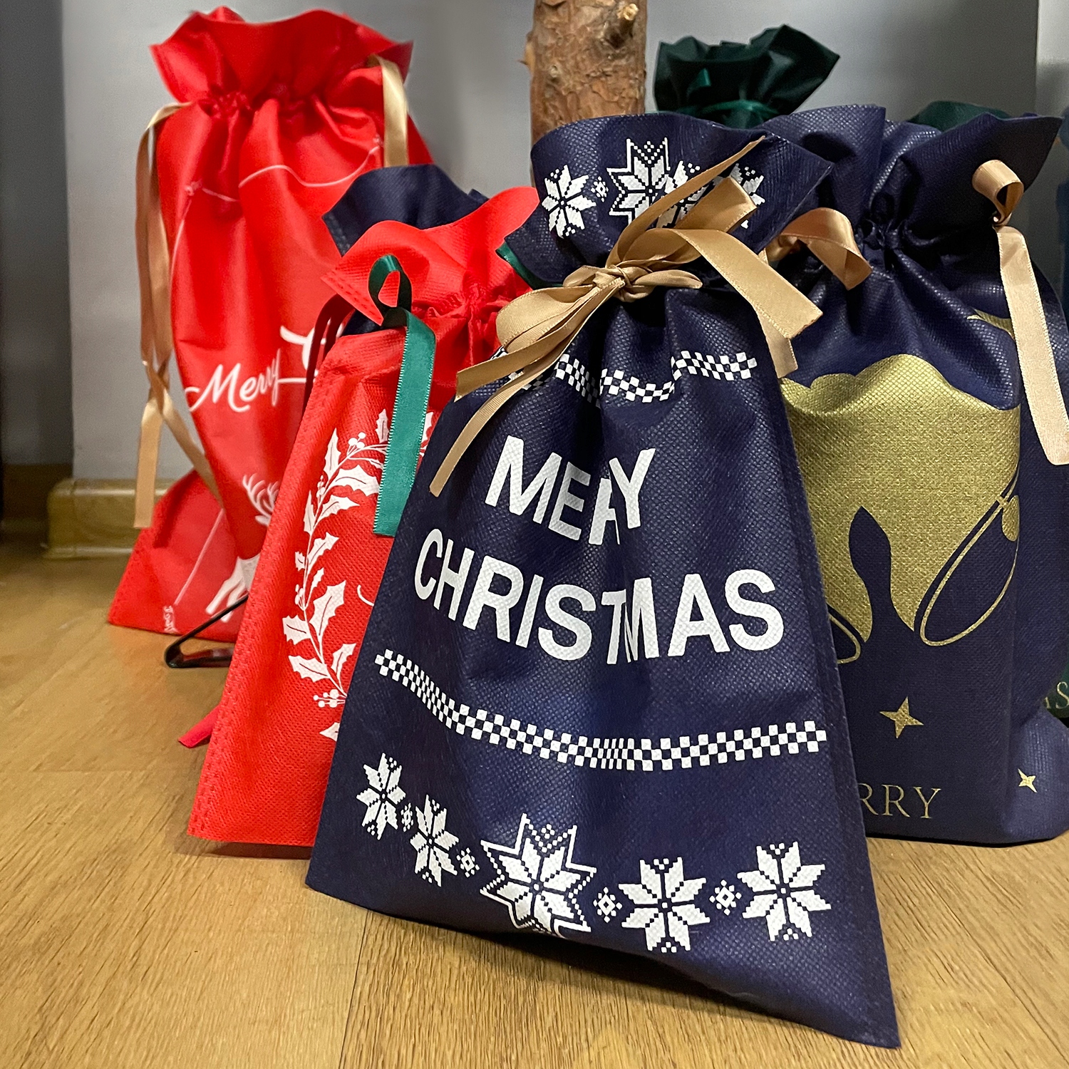- Zestaw Bożonarodzeniowych torebek prezentowych z materiału non woven ze świątecznym nadrukiem.