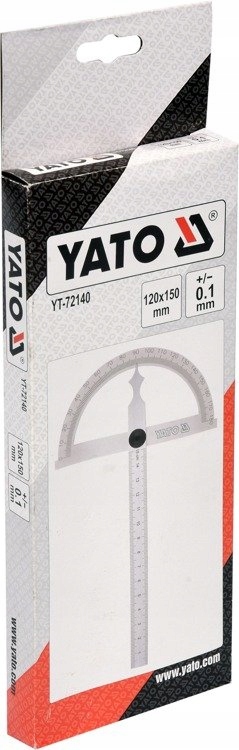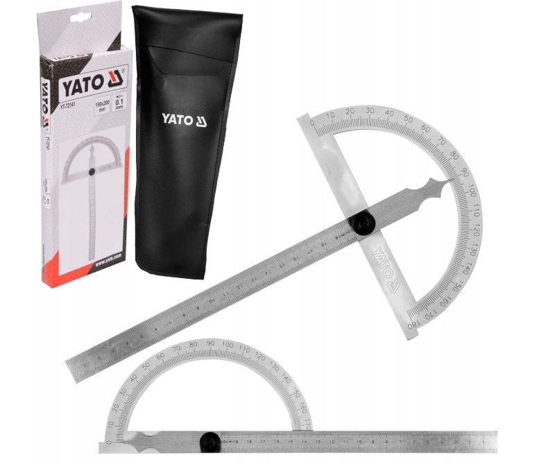 Kątomierz 150 x 200 mm ,wykonany ze stali wysokowęglowej .Zakres pomiaru 180°. Rozdzielczość 1°, dokładność +/- 0,1°