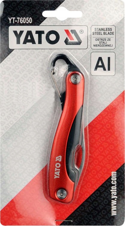 Lekki nóż składany YATO z ostrzem typu ‘bowie’ ze stali nierdzewnej o długości 75 mm, korpus metalowy anodyzowany zakończony dużym karabińczykiem.