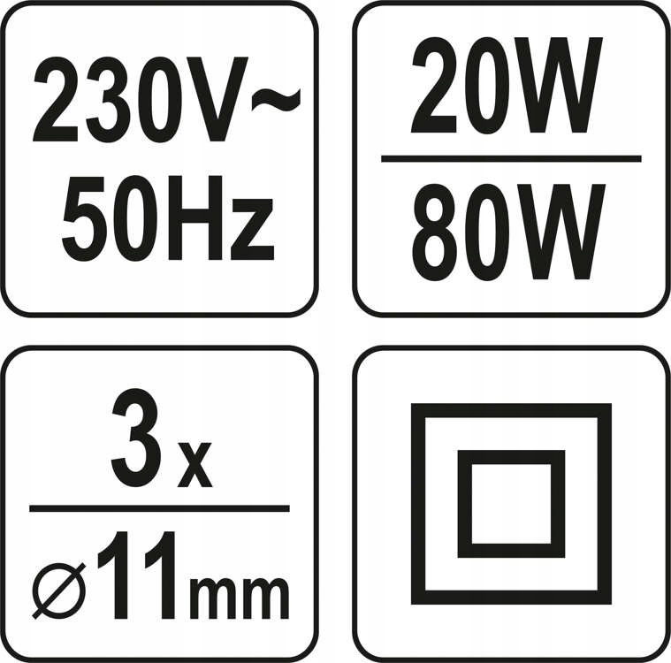 Dzięki zastosowaniu bardzo wydajnej grzałki o mocy 80W pistolet nagrzewa się do temperatury 180~200°C w zaledwie 3~5min. Następnie przechodzi w stan podgrzewania pracując z mocą 20W, co znacznie redukuje zużycie energii elektrycznej.