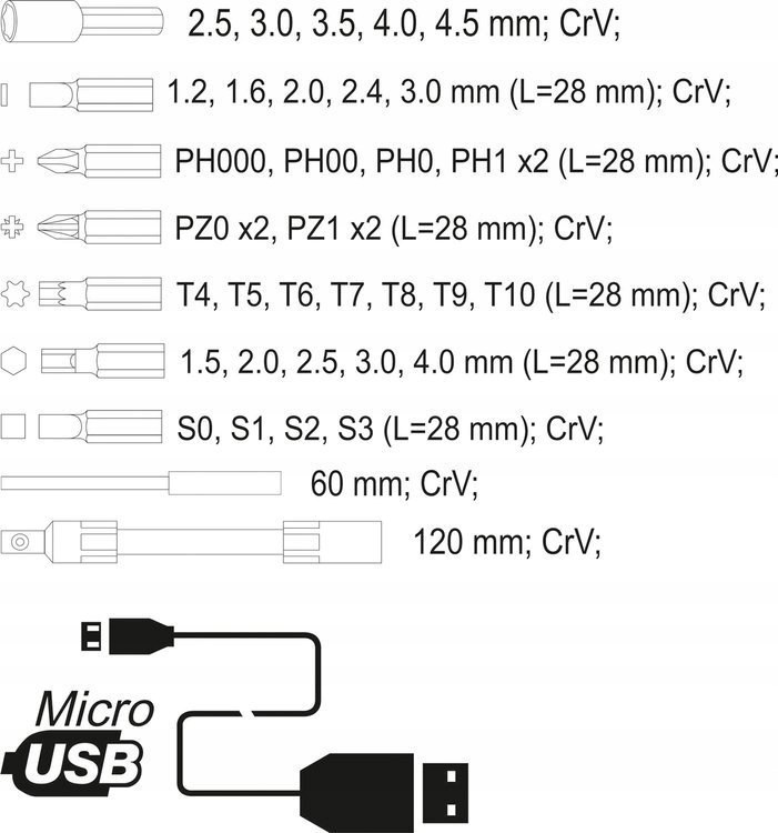 - Phillips: PH000, PH00, PH0, 2 x PH1