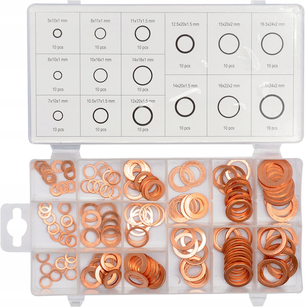 Zestaw podkładek miedzianych do zastosowań warsztatowych. Zawartość opakowania: 10 szt: 5x10x1; 10 szt: 8x11x1; 10 szt: 11x17x1,5; 10 szt: 12,5x20x1,5; 10 szt: 15x20x2; 10 szt:16,5x24x2; 10 szt: 6x10x1; 10 szt: 10x16x1; 10 szt:14x18x1; 10 szt: 7x10x1; 10 szt:10,5x17x1,5; 10 szt:12x20x1,5; 10 szt:14x20x1,5; 10 szt: 16x22x2; 10 szt: 17,5x24x2. Całość zapakowana w poręczne plastikowe pudełko z przegrodami zapewniającymi porządek i prawidłową segregację rozmiarów podkładek.