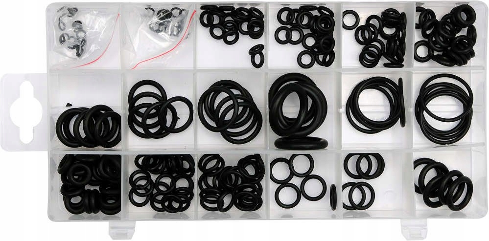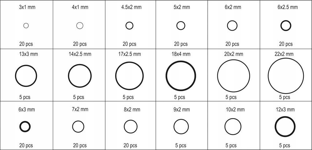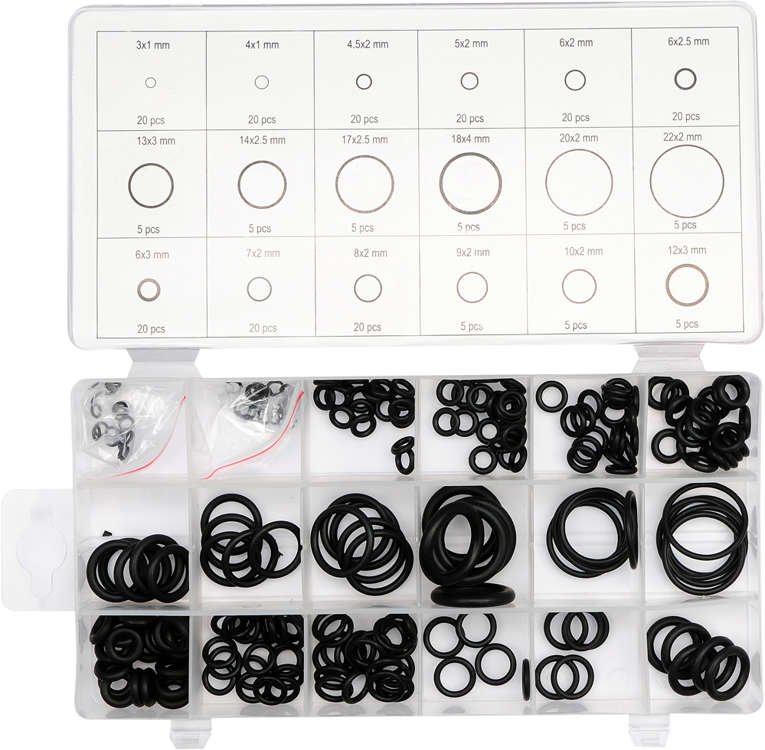 Praktyczny zestaw 225 O-ringów gumowych. Zawiera mix 18 różnych rozmiarów. O-ringi wykonane są z gumy odpornej na czynniki agresywne takie, jak paliwa, oleje i chemikalia oraz wysoką temperaturę. Praktyczne opakowanie pozwala na łatwy dostęp do dogodnego rozmiaru.