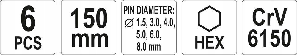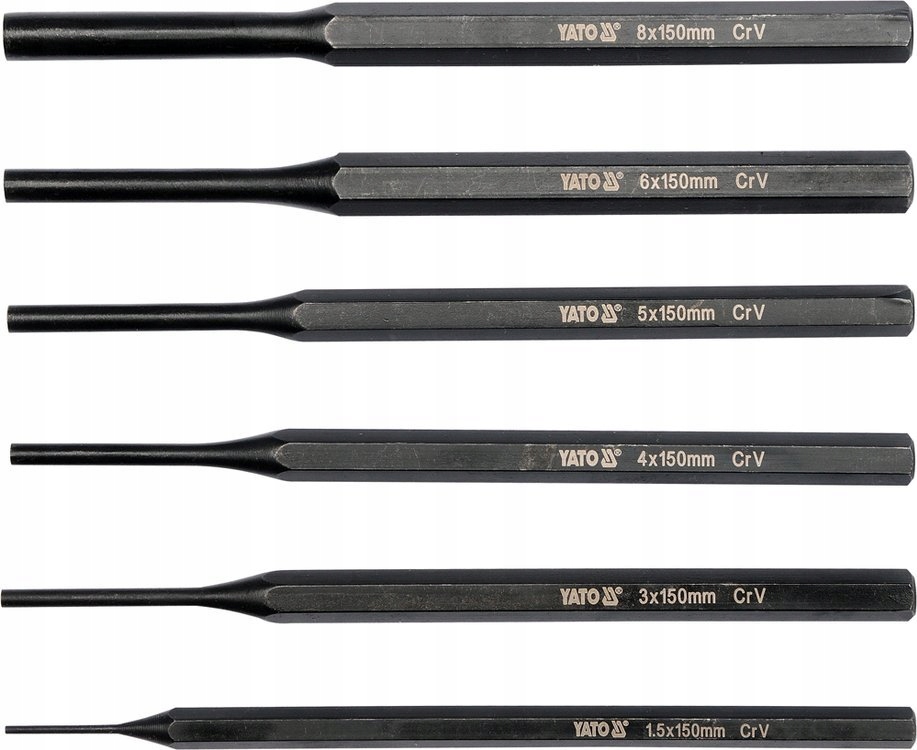 Zestaw zawiera sześć precyzyjnych wybijaków o wymiarach 1,5x150mm, 3x150mm, 4x150mm, 5x150mm, 6x150mm i 8x150mm. Wybijaki wykonane ze stali CrV 6150 z pręta sześciokątnego. Powierzchnia narzędzi czerniona. Zestaw zapakowany w plastikowy pojemnik.