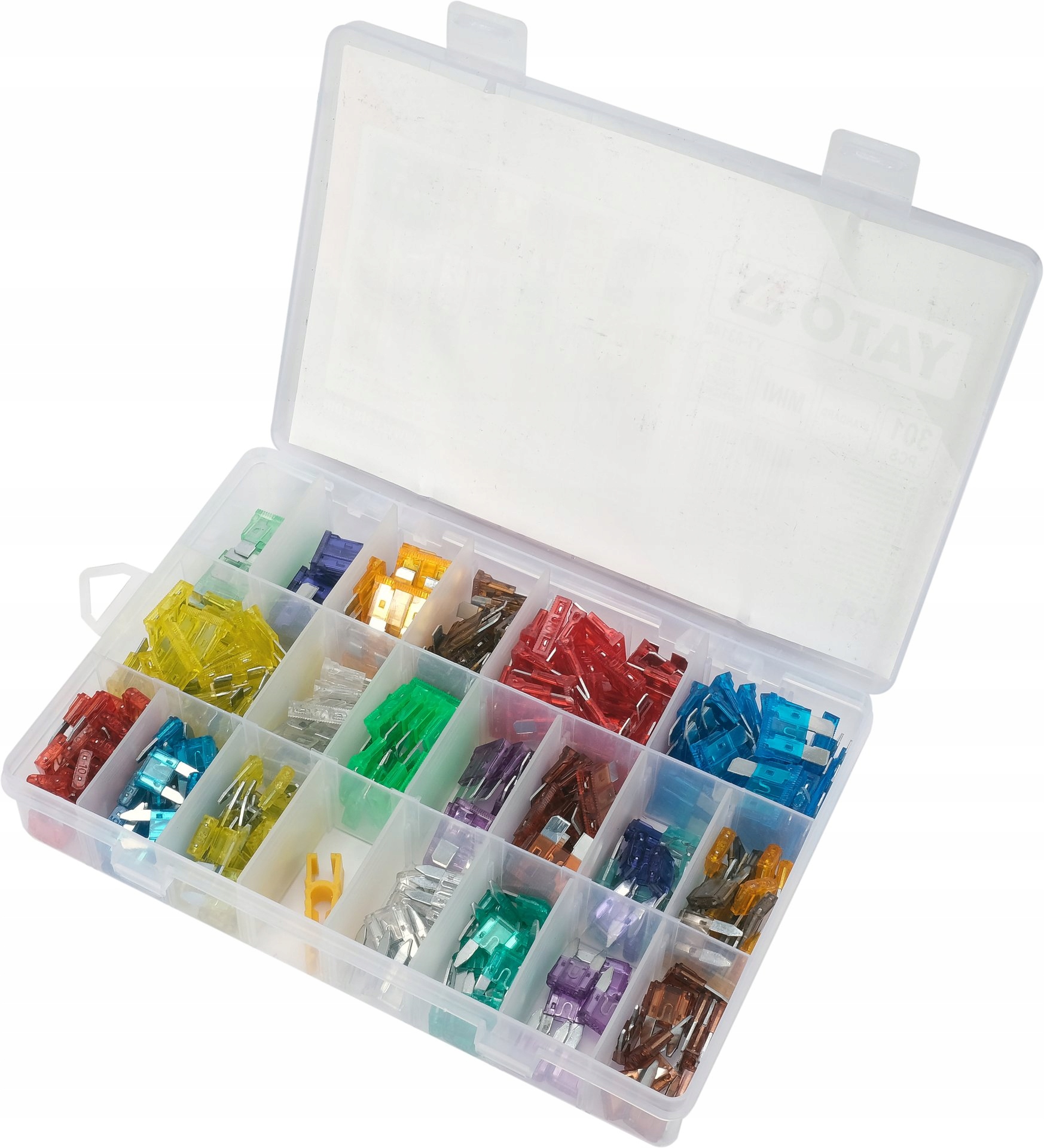- Zawartość zestawu: bezpieczniki x300 (mini: 2A x6, 3A x6, 5A x12, 7.5A x10, 10A x28, 15A x24, 20A x22, 25A x10, 30A x14, 35A x6, 40A x12;
