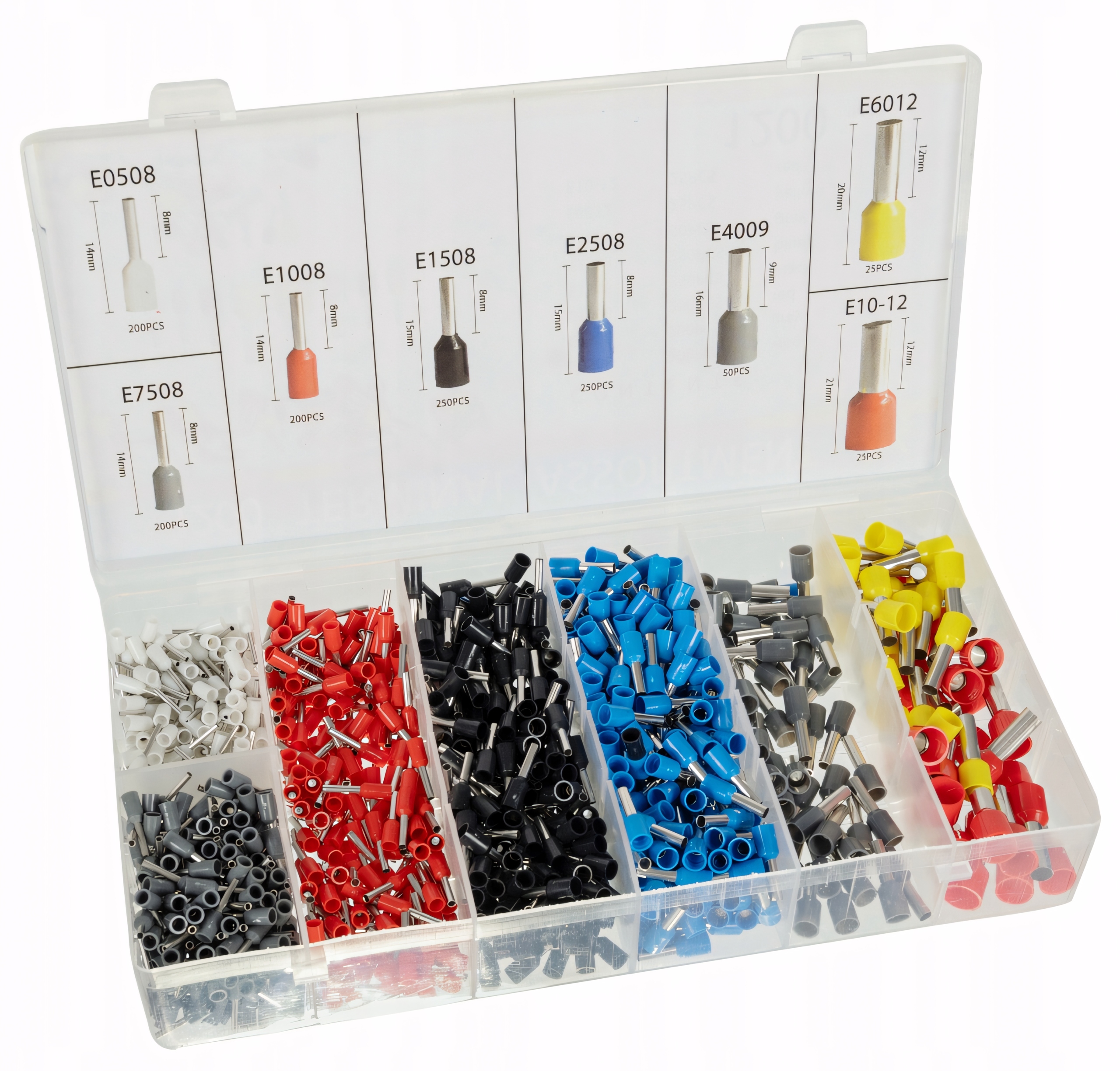 - ORGANIZER Z 8 ROZMIARAMI TULEJEK – w zestawie z zaciskarka jest przeźroczysty organizer mieszczący w sobie 8 różnych rozmiarów końcówek od zaciskania od 0,5 mm² do 10 mm². Każdy rozmiar jest w innym kolorze.