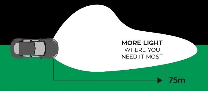 Nasza najbardziej zaawansowana jak dotąd wiązka światła, dostrojona tak, aby dostarczać 180% więcej światła dokładnie tam, gdzie jest ono najbardziej potrzebne. Wzbogacony o nowy potrójny niebieski odcień żarówki dla uzyskania bielszego światła.