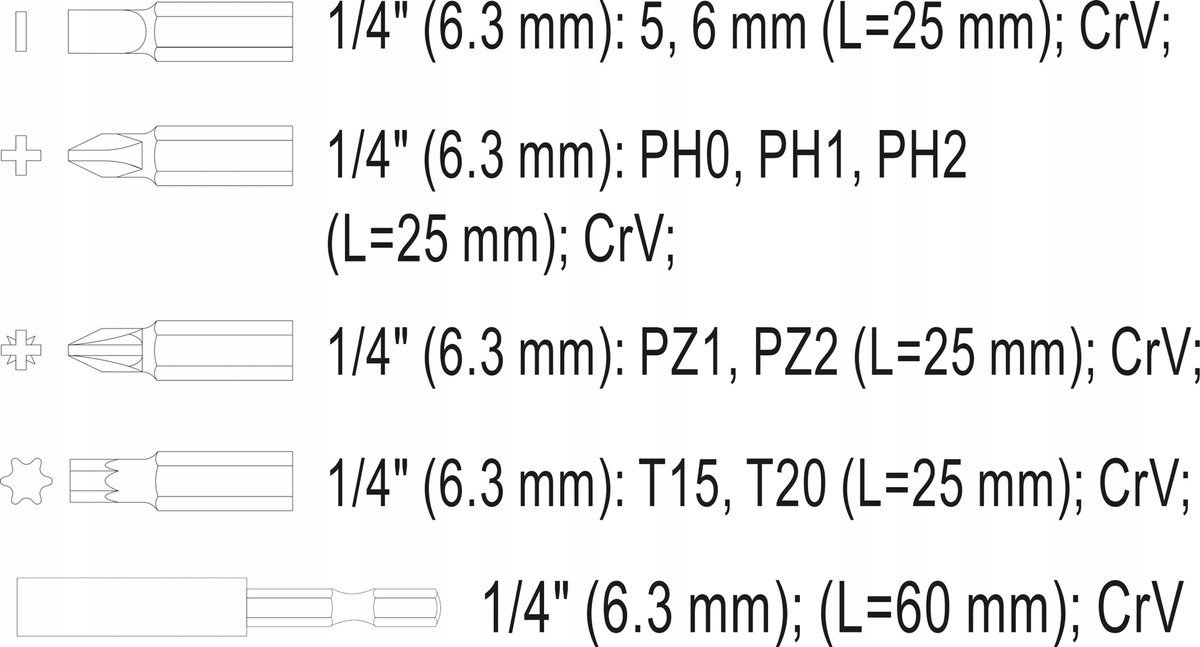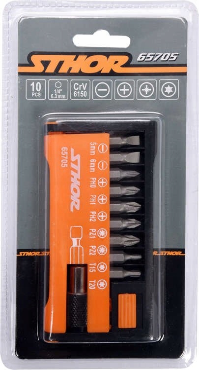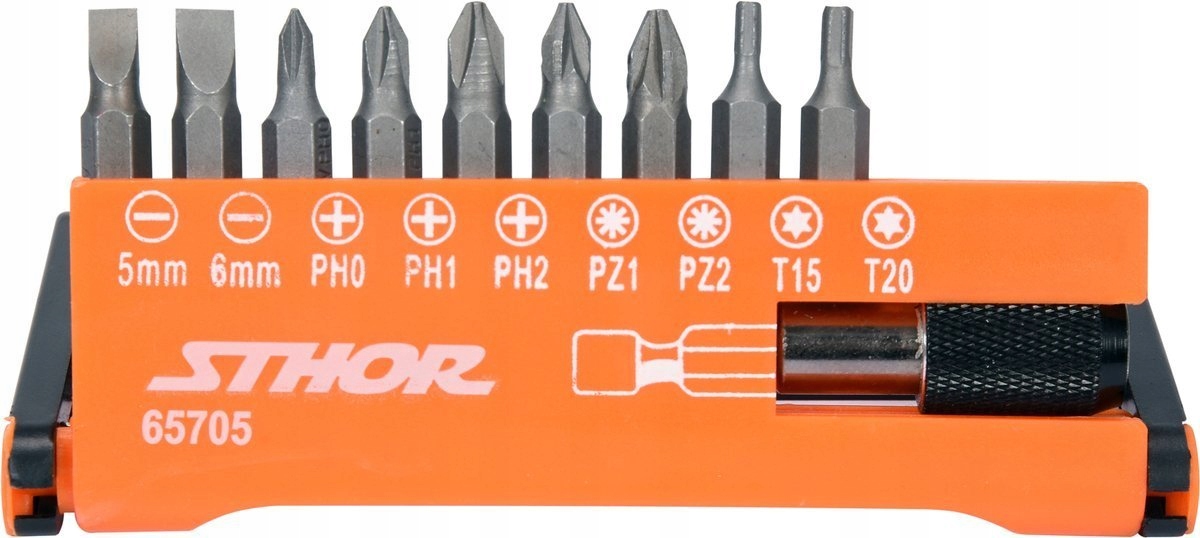 Zestaw końcówek śrubokrętowych marki STHOR 65705 Zestaw składa się z 9 sztuk bitów: płaskie: 5, 6mm, PHILLIPS: PH0, PH1, PH2, POZIDRIVE: PZ1, PZ2, TORX: T15, T20, oraz jednej sztuki adaptera o długości 60mm. Bity piaskowane, wykonane ze stali 6150CRV.