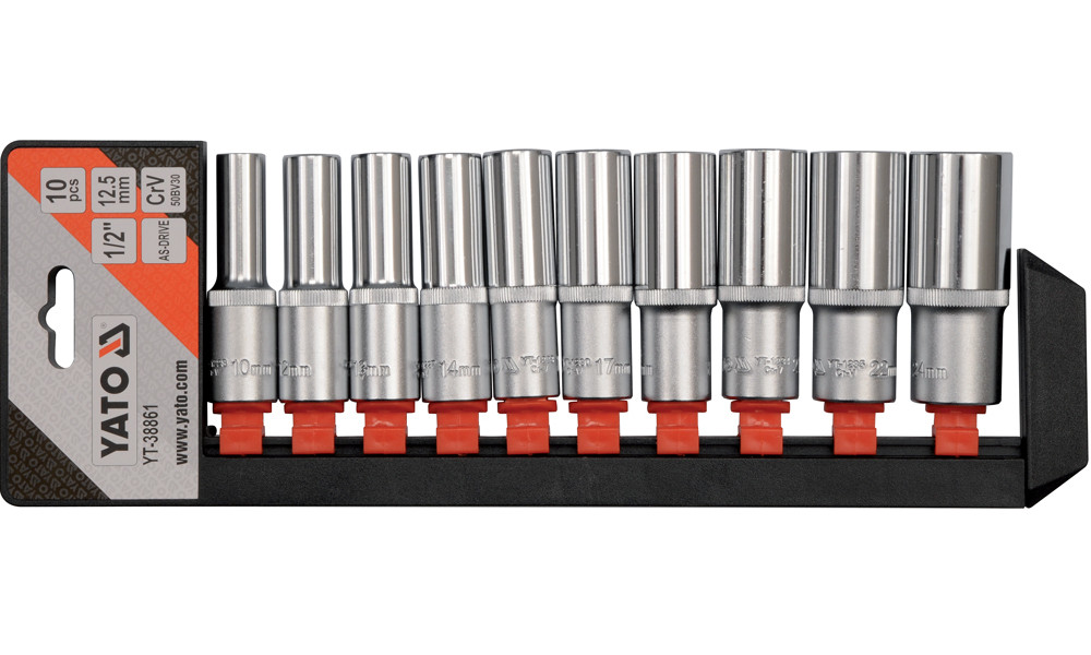 Komplet nasadek szczególnie polecany dla profesjonalnych serwisów samochodowych i mechanicznych, doskonale współpracują z grzechotkami YATO. Nasadki wykonano metodą kucia matrycowego, a przed wykonaniem procesu hartowania poddano je kalibracji za pomocą precyzyjnych przymiarów i urządzeń kontrolnych. Wyposażone w system AS-Drive, zwiększający maksymalny moment o 25%, przy pełnej ochronie obrzeży nakrętek, nasadki z dwutonowym wykończeniem powierzchni.