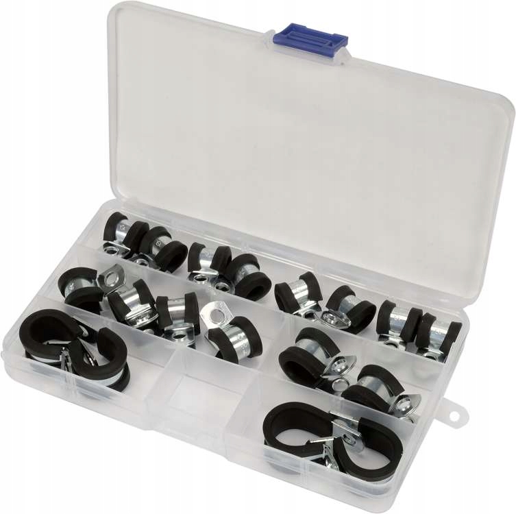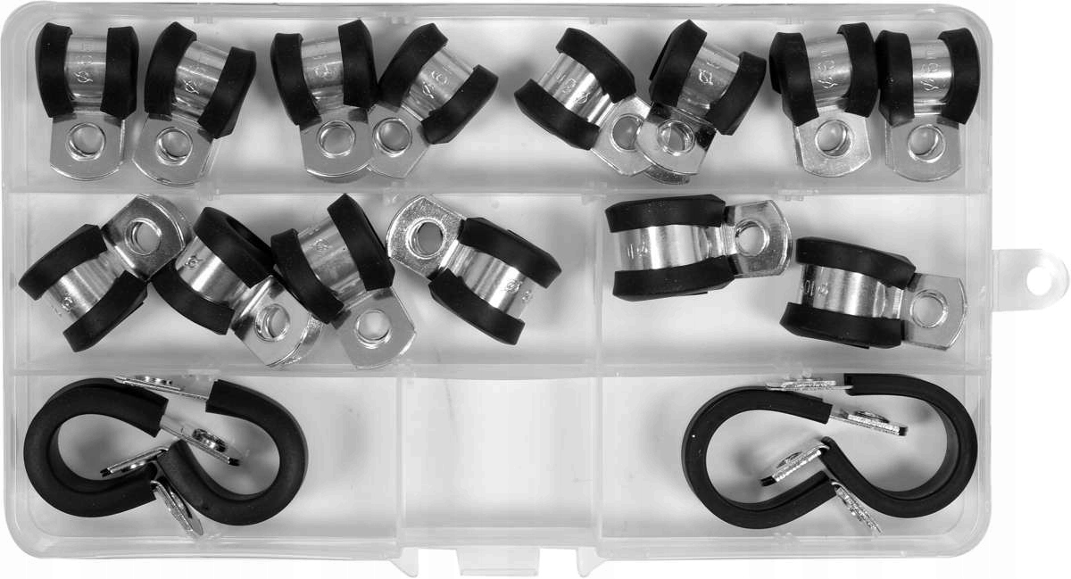 Zestaw 18 opasek zaciskowych wykonanych ze stali galwanizowanej i gumowej osłony.