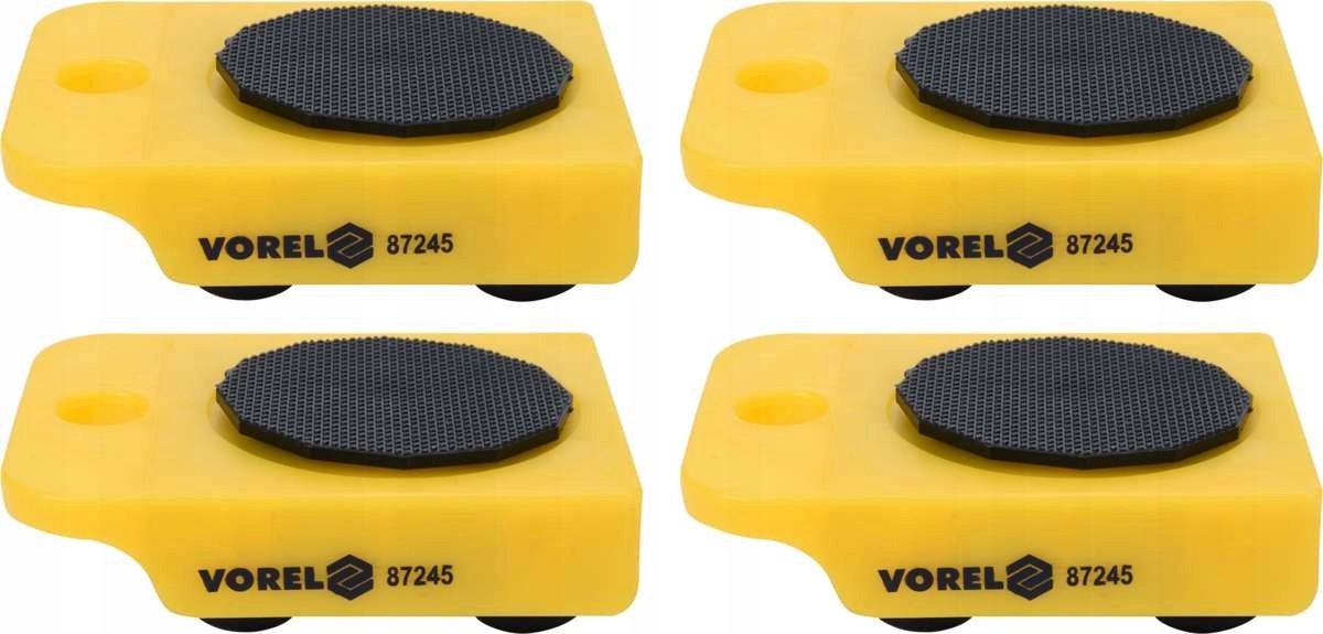 Plastikowe podstawki z rolkami przeznaczone do transportu i ustawiania mebli lub innych ładunków o ciężarze do 150 kg. Stalowa dźwignia służy do uniesienia ładunku przed wsunięciem podstawek z rolkami .