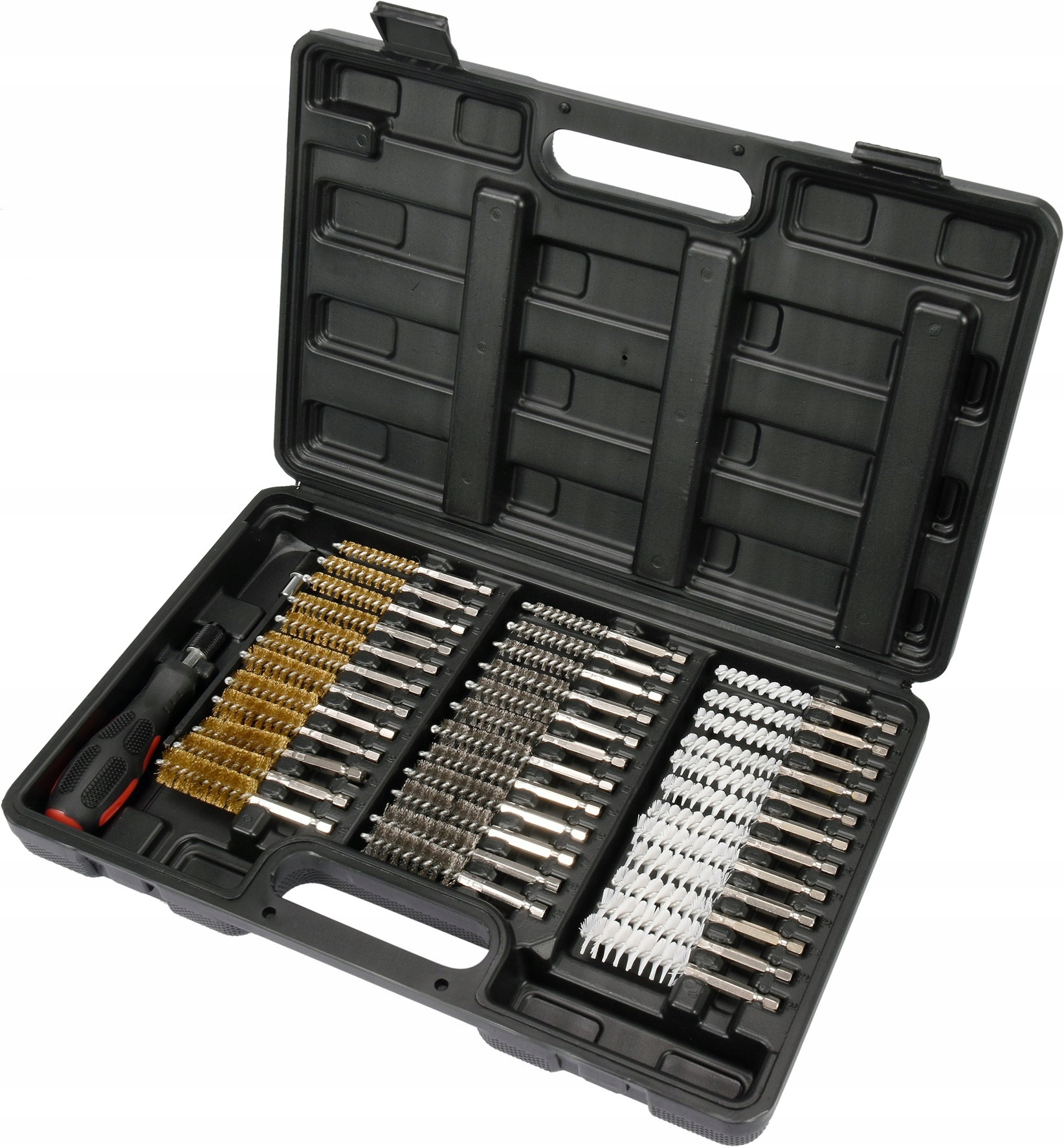 38-częściowy zestaw szczotek przeznaczonych do usuwania zanieczyszczeń i opiłków z wierconych otworów, rur, gniazd wtryskiwaczy, świec itd.
