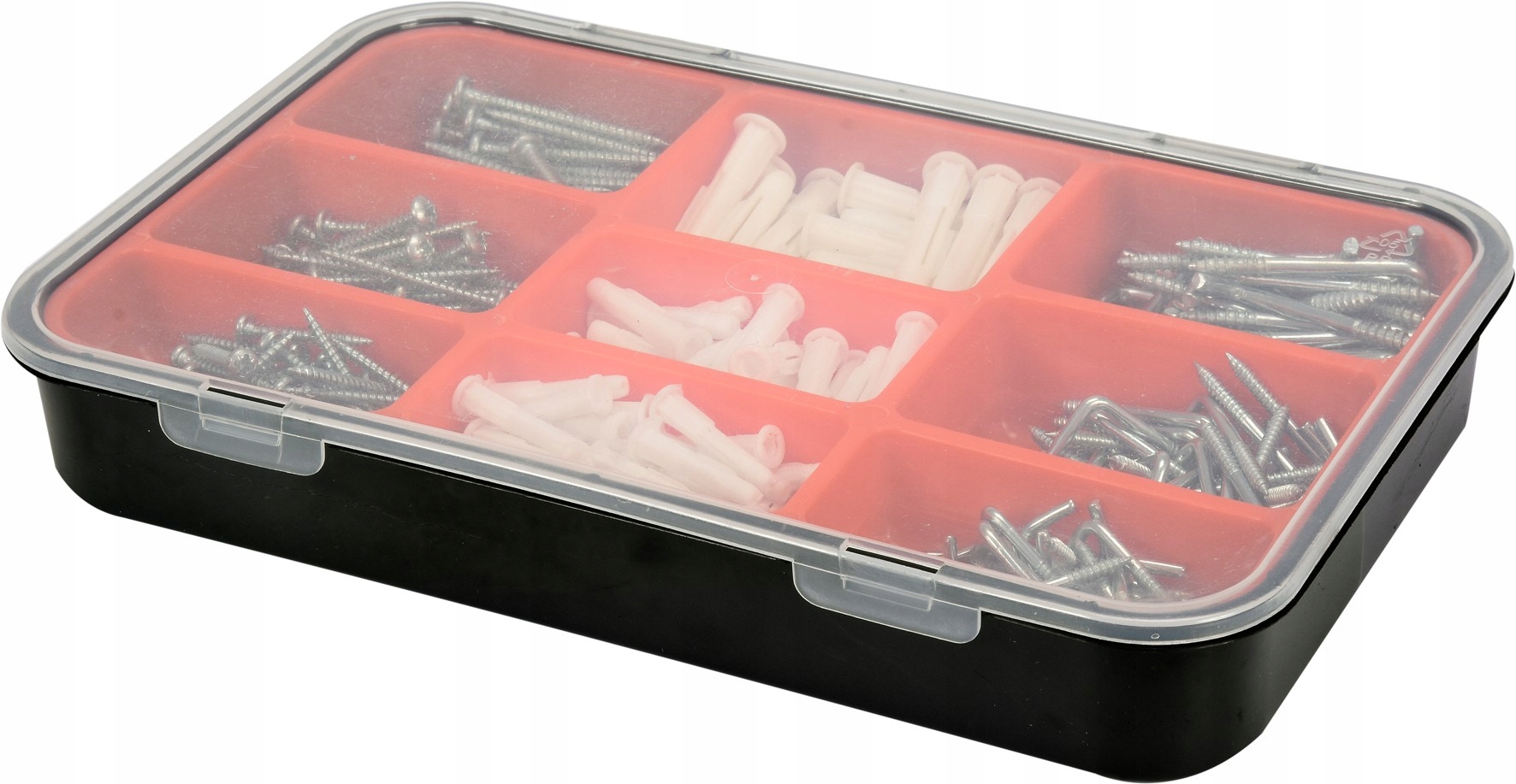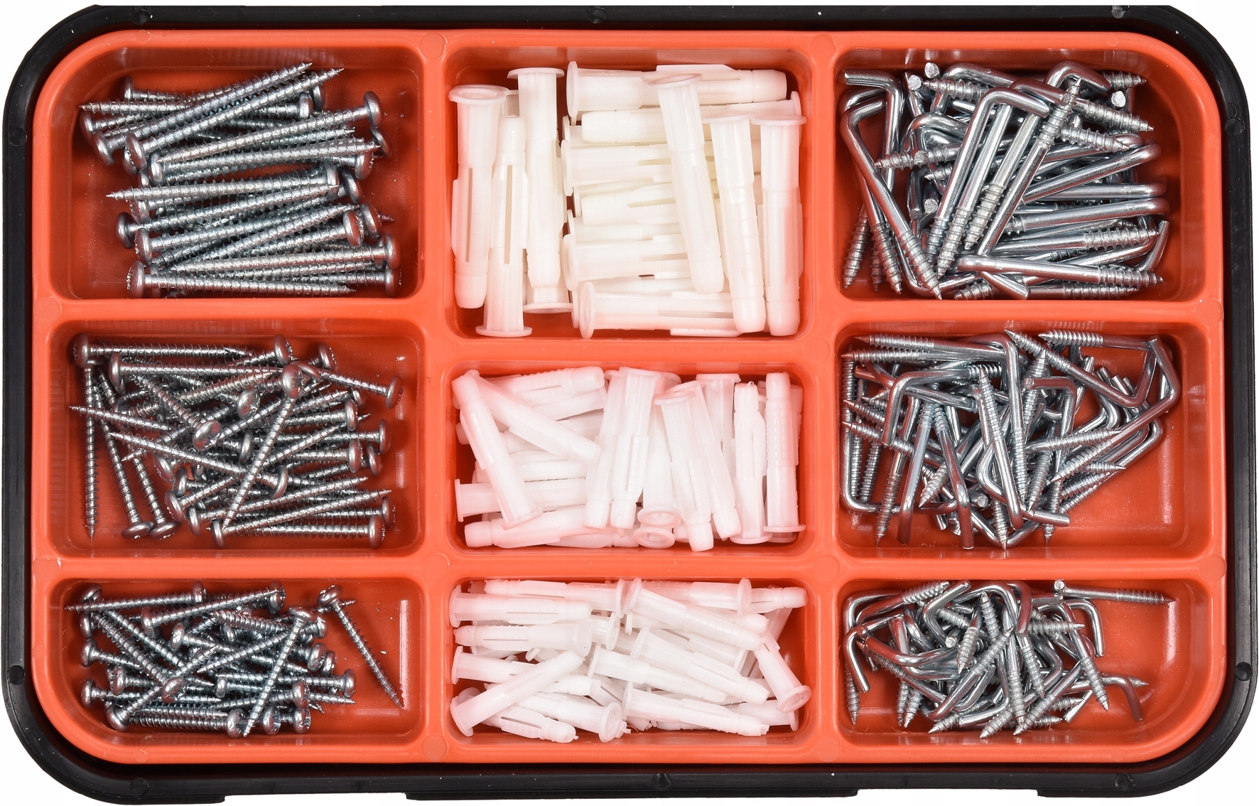 Zestaw wkrętów i kołków rozporowych marki Vorel 24112. Wykonane z materiałów wysokiej jakości. Szeroki zakres rozmiarów zapewnia dobranie elementów właściwych do obciążenia, sposobu mocowania i powierzchni. Umieszczone w kasetkach z przegrodami, ułatwiającymi segregację.